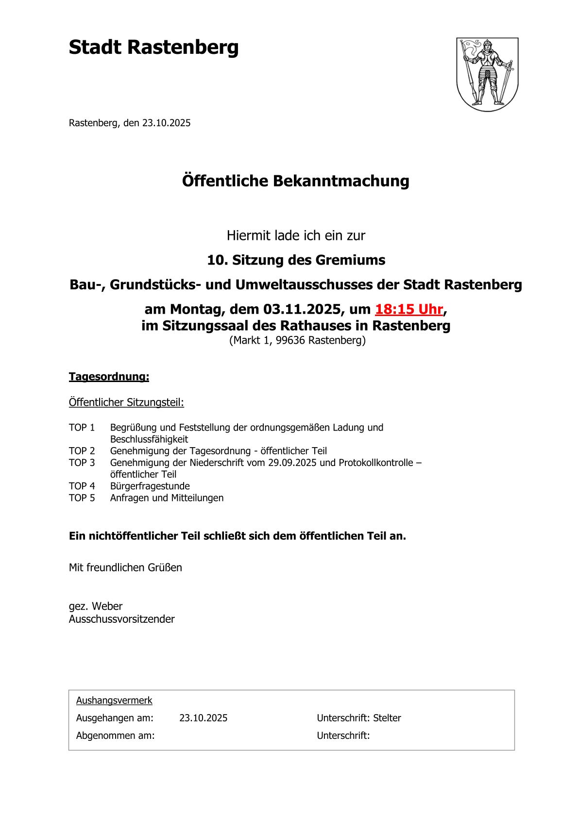 18. Sitzung des Gremiums Bau-, Grundstücks- und Umweltausschusses der Stadt Rastenberg