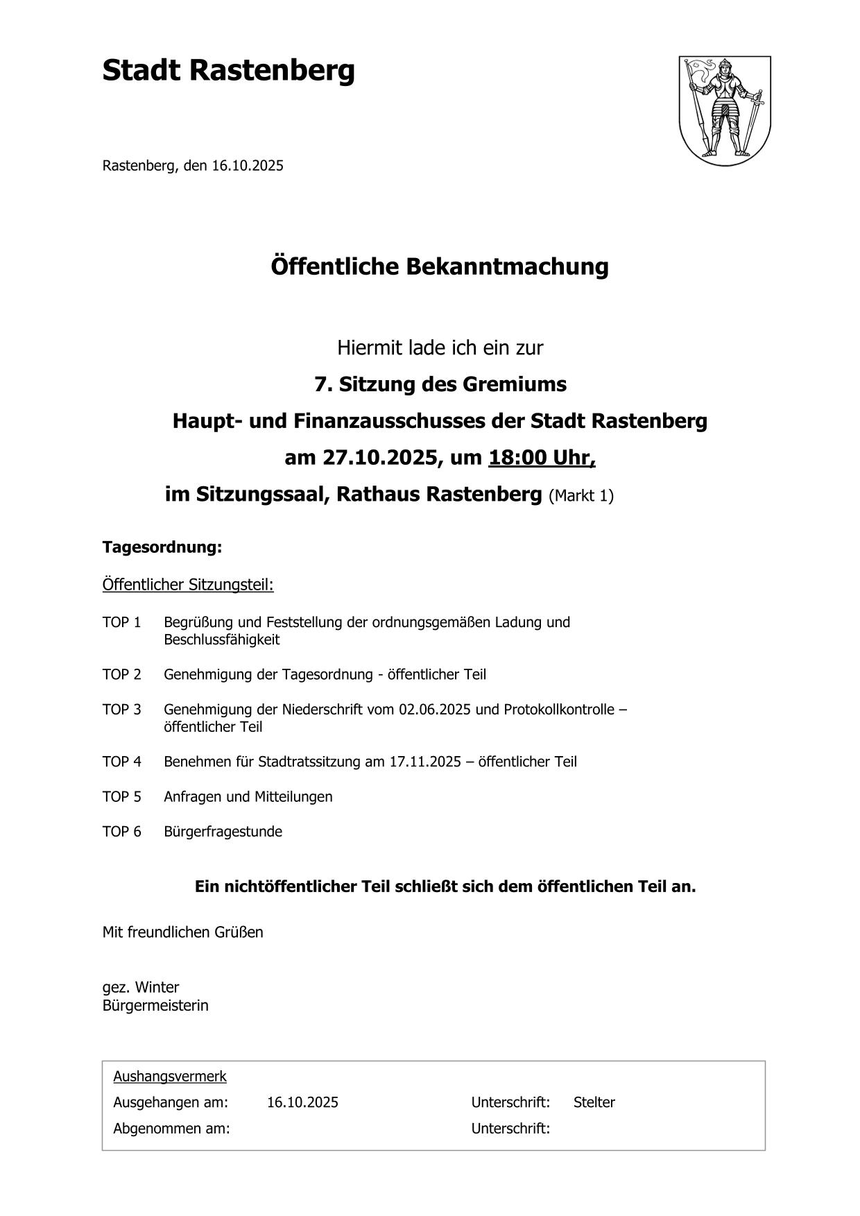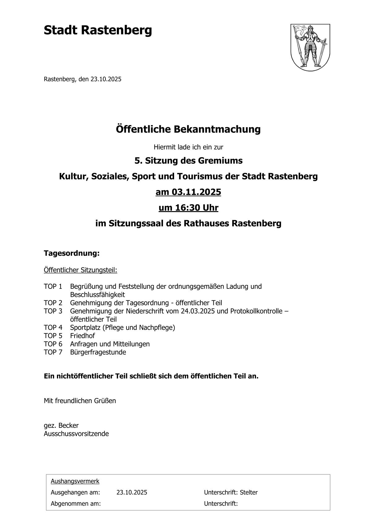 Öffentliche Bekanntmachungen der Stadt Rastenberg